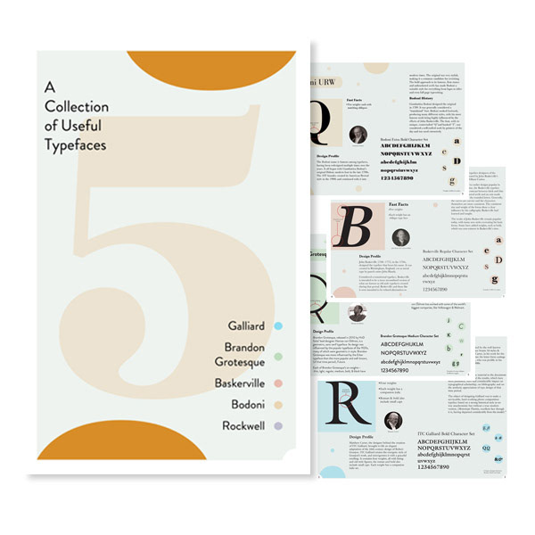 Five different, compatible fonts in a style book extolling each